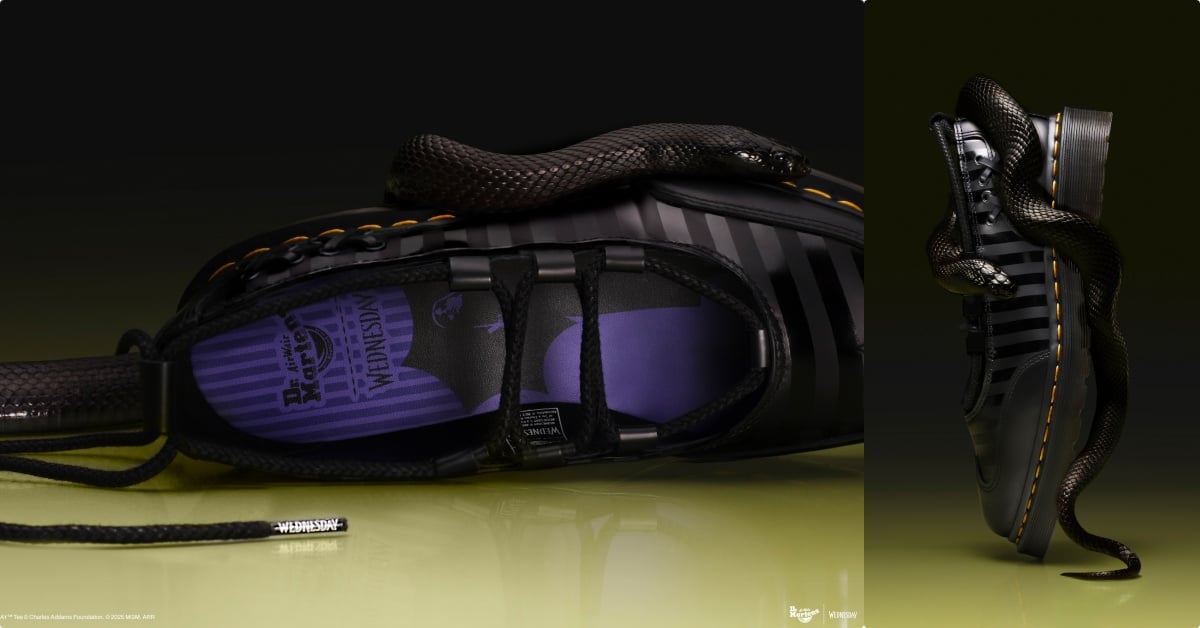 哥德少女必備戰靴來啦!Dr. Martens與Netflix 熱門影集《星期三Wednesday》再度跨界聯手,馬汀靴、瑪莉珍鞋、芭蕾舞鞋注入滿滿「星期三阿達的暗黑魅力」,聯名1460八孔馬汀靴採用黑絲絨拼接Nappa Lux皮革,搭配錐形鉚釘、紫色後跟拉環與鮮明黃色縫線叛逆又獨特。聯名瑪莉珍鞋以劇中的蜘蛛紋、玻璃窗為靈感設計,而聯名芭蕾舞鞋則搭配招牌條紋元素,2雙都有「主角WEDNESDAY」的字樣加持喔~