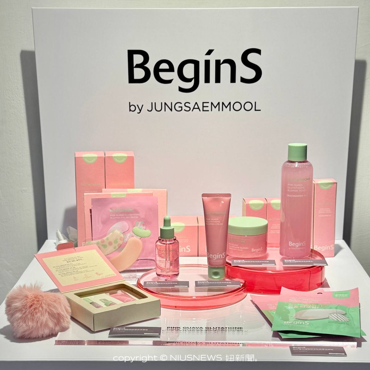 由韓國明星彩妝師鄭瑄茉(Jung Saem Mool)所打造的BeginS,代言人找來韓國男團TWS,以清新的品牌形象詮釋無瑕肌膚X服貼妝感的保養日常。主打商品為Pink Guava Glutathione Blemish Serum,讓素顏也能發光。這次在快閃店內特別展示剛在韓國發表的新品,包含「粉紅番石榴谷胱甘肽亮膚水」、「粉紅番石榴谷胱甘肽微導淡斑貼」、「粉紅番石榴谷胱甘肽煥亮淨膚組」等。