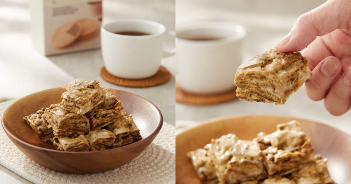 酥酥脆脆的焙茶棉花糖Q餅不僅單吃美味,妞編輯推薦可以和低負擔的希臘優格加上新鮮水果如香蕉、草莓、奇異果等,當成日常的早餐,加入麥片會更有飽足感!