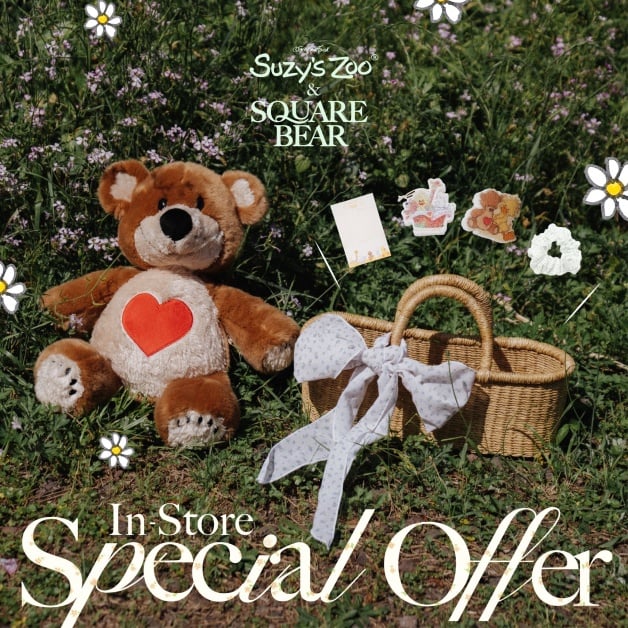 於5月31日至6月2日,購買Suzy's Zoo系列商品+跟門市限定裝置拍照,上傳標記SQUAREBEAR IG即享限定贈品 ,每日限量10名,活動贈品分別為「5/31 多功能木漿棉清潔海棉、6/1 聯名碎花髮圈、6/2 聯名待辦便條紙」,特別是海綿收藏價值極高啊!