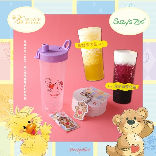 無尊開設的手搖品牌「無飲」不僅推出四款「Suzy's Zoo」限定飲料杯,還有全新聯名「鳳梨熊冰茶」、「熊愛葡萄奶霜」兩款清爽解膩限定果系飲品,5 月 30 號正式開賣。6月1日起,凡購買任一新品,即可以優惠價350元加購「Boof 造型悠遊卡」(原價450元)、優惠價128元加購限定環保杯!