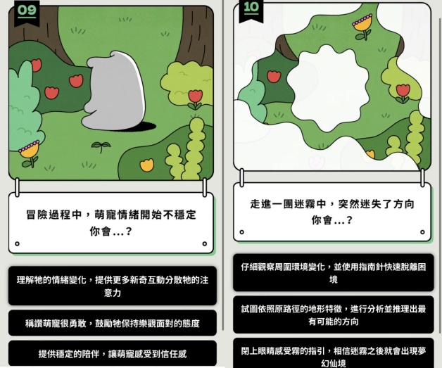 冒險過程中,萌寵開始情緒不穩定,妞編輯肯定是提供陪伴,告訴他:別怕我在!忽然進入一團迷霧迷失方向,大家這時候會怎麼想,觀察周圍、分析推理,又或者索性閉上眼感受這一切!