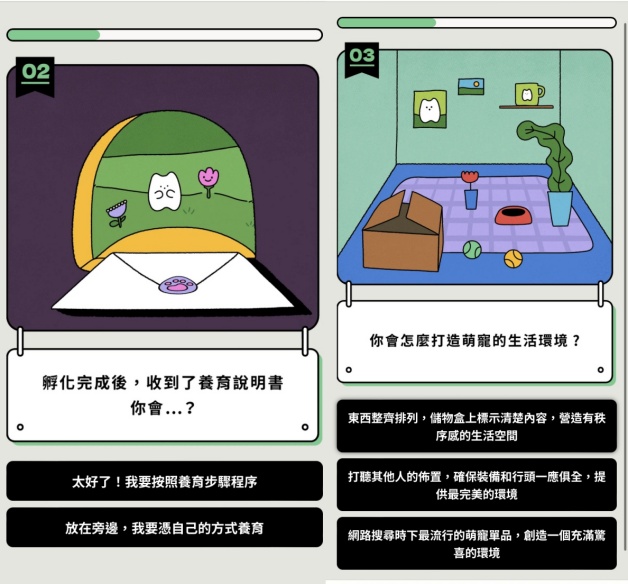 孵化完後收到了養育說明書,妞妞們是會乖乖照步驟的嗎,還是順從內心方式?要幫萌寵打掃生活環境啦~妞編輯一定要讓自己的萌寵走在潮流尖端,替他準備各種漂漂亮亮的東西!