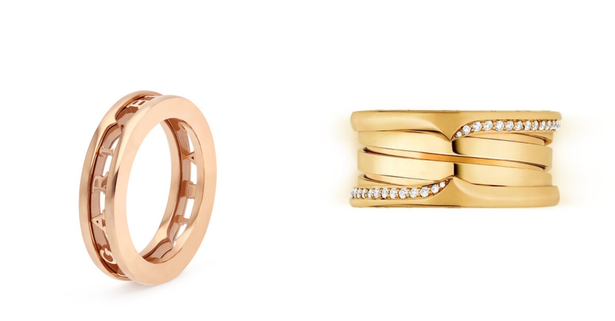 BVLGARI B.zero1 Logo系列玫瑰金戒指 NT.53,800、BVLGARI B.zero1 New Wave系列黃K金三環戒指 NT.137,600