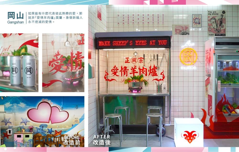 另外讓妞編輯眼睛一亮的還有岡山區的「愛情羊肉爐」,說到岡山絕對會想到羊肉爐,和其他戶政事務走可愛清新、氣質的風格不同,岡山區有一種濃濃地復古時尚感(偷偷覺得很有詹記麻辣火鍋的感覺XD),LED燈條、瓶身印著「岡」字樣的飲料罐、牆上的廚具、菜單等細節度滿點,在這裡一定可以拍出非常有態度的結婚登記照(超級喜歡這個主題)!