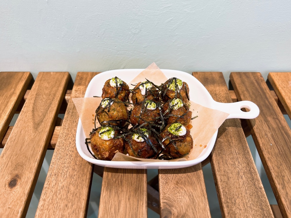 喜歡吃章魚燒的妞妞一定要來一份「小植燒」!為了打造闆娘喜歡的章魚燒口感,老闆可是煞費苦心,試過很多不同的食譜才終於找到黃金比例。老闆利用杏鮑菇取代章魚腳,解決了章魚腳咬不爛的問題;外層酥脆配上裡頭蔬菜的綿密,最後佐上自製豆乳美乃滋及海苔,濃郁的海味也能撲鼻而來。