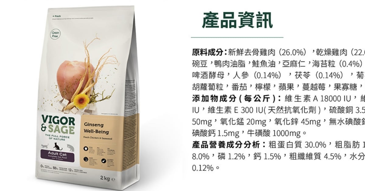 貓飼料推薦10.Vigor&Sage靈萃:低敏無穀貓糧(人參)
