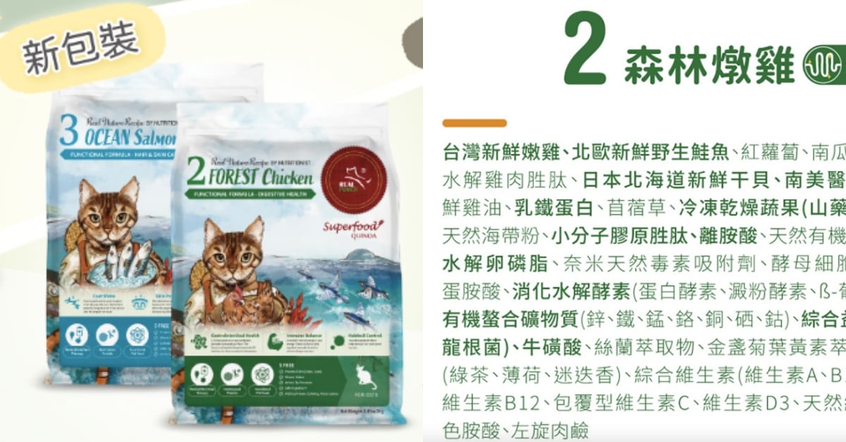 此品牌貓飼料獲得SNQ國家品質標章(安全及品質認證),針對台灣四季環境設計專屬配方,動物性蛋白質高於91%,不含人工防腐劑,富含益生菌及酵素,且添加草本纖維幫助貓咪排去體內廢毛,此外更添加魚油提升毛孩免疫力。