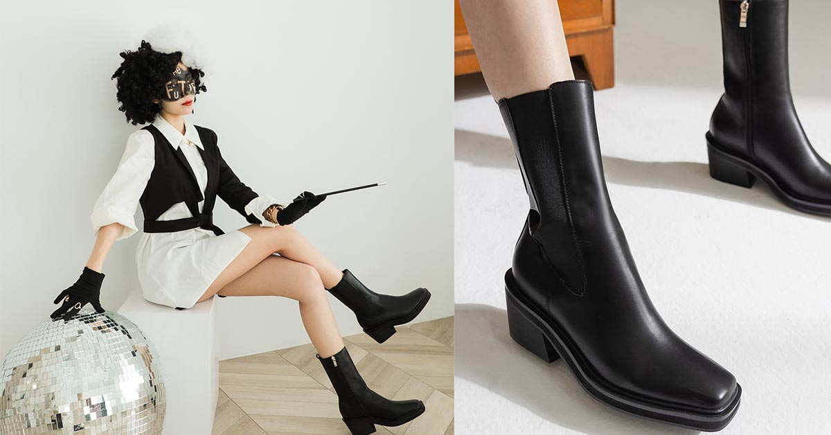 時尚惡女庫伊拉-方頭粗跟中筒切爾西靴