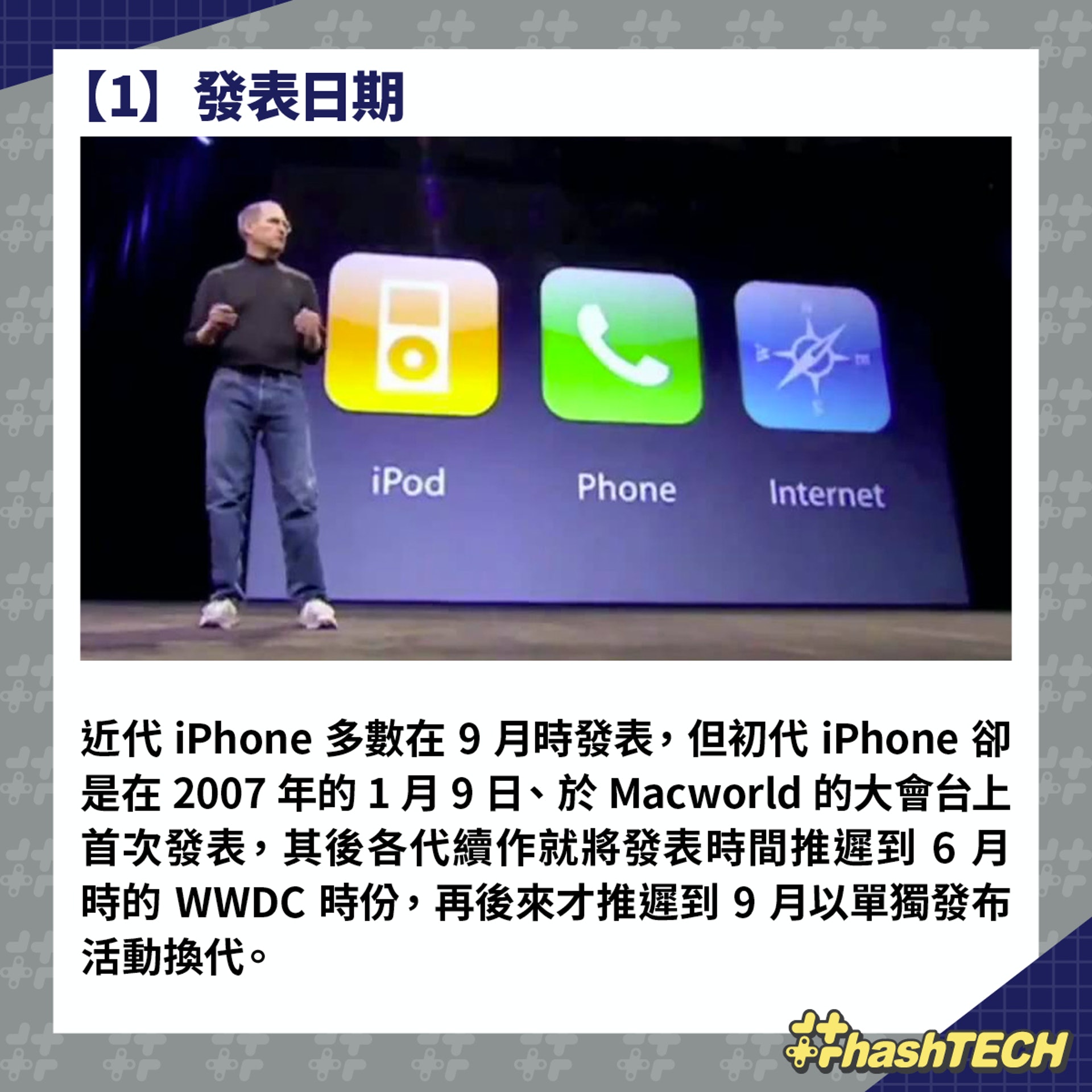 可能有讀者會問:「iPhone不是每年9月才會推出新一代的嗎?為何1月就是iPhone誕生15周年呢?」雖然近年Apple習慣了在第4季才發表新一代iPhone,但其實首代iPhone(亦有人稱之為「iPhone 2G」的一代),是在現在已經停辦的Macworld展覽上由Steve Jobs親自發表,而該展一直是慣常在年初舉行的。