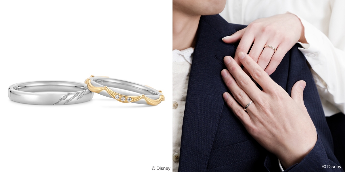 女戒以黃K金設計出具有立體感的飄逸禮服,色彩搭配令人印象深刻。戒指上3顆配鑽流露上乘光芒,增添畫龍點睛之效。男戒則以野獸的爪痕為主題,造型簡約十分耐看,讓人充分感受到故事的帶入感~(燒火程度看了都想婚了♥д♥)