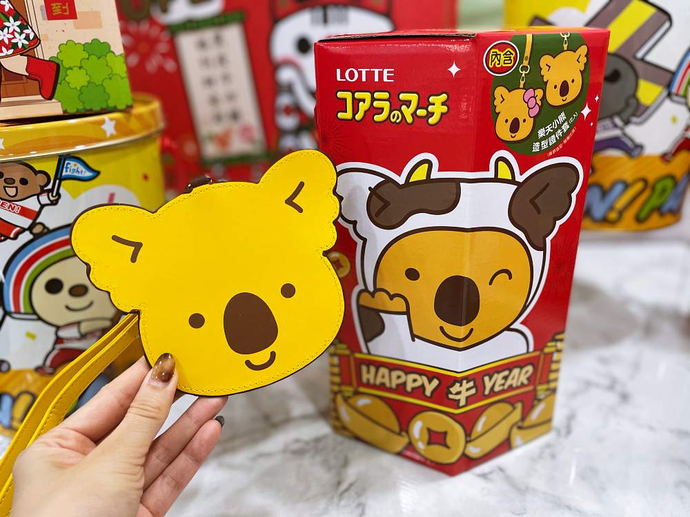 不二家Peko醬推出的提籃禮盒內含原味、草莓、抹茶三種口味軟糖,而樂天小熊禮盒則隨附造型證件套,另外還有相當應景的「朝隈俊男聯名公仔蛋捲禮盒」,內隨機贈送一隻招財大牛!