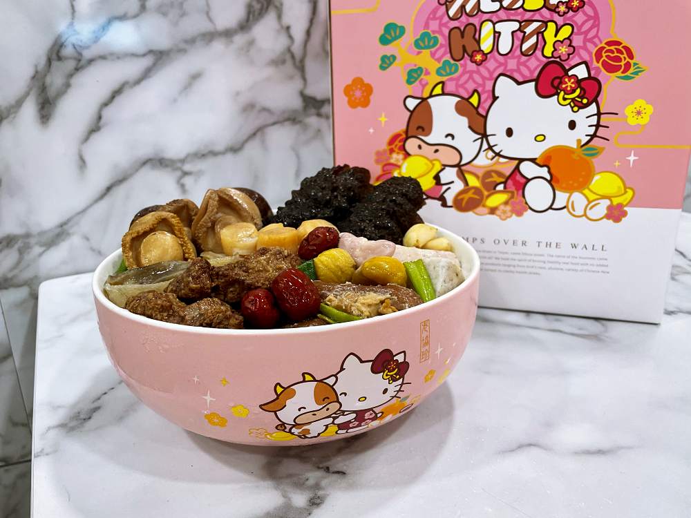 三麗鷗週邊還有老協珍推出的「花喜團圓佛跳牆」與「花喜福滿年菜組」,佛跳牆特別以粉色玻璃湯碗盛裝,內含南非鮑魚、黑玉烏參與北海道干貝等食材;年菜則有紅燒花菇鮑魚、烏參牛三寶與無錫子排,同樣隨附萌度超高的造型瓷盤。(即日開放預購)