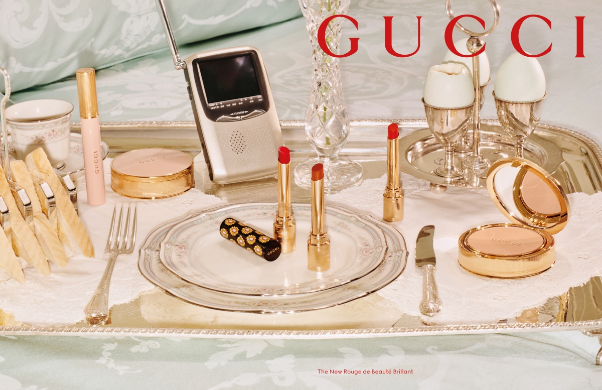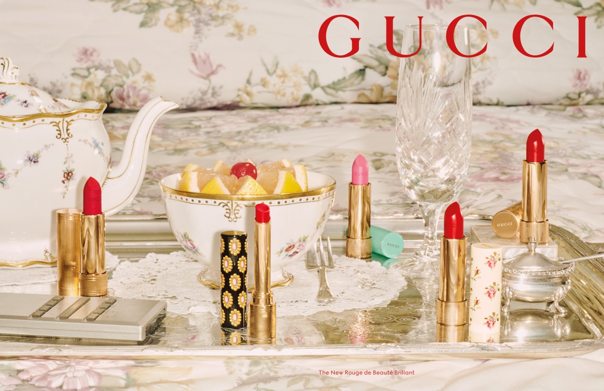 由Gucci Beauty 國際化妝師Thomas de Kluyver指導上妝步驟,從Gucci 傾色琉光唇膏15種色調中挑選展現自我的顏色。唇膏軟滑、滋潤的質地便於反覆塗抹以控制色澤的濃烈程度,從而更容易嘗試全新大膽的妝效;無須護唇膏打底,皮膚的自然體溫能將其深層滋潤配方融化,因此可單獨使用打造美麗誘人雙唇。1次塗抹展現若隱若現光澤,反覆塗抹3次則帶來閃耀色彩和充分的保濕效果。形象廣告,Gucci 傾色琉光唇膏形象照由Mark Peckmezian操刀、Christopher Simmonds作美術指導,打造出富有懷舊風情的床上早餐情境。畫面中的Gucci 傾色琉光唇膏出現於一間滿佈時代痕跡的房間中,唇膏隨意散落於沉甸的花卉、精緻的鍍金瓷器,以及盛載果汁和茶的美麗早餐托盤間,帶領觀眾沉浸於80年代的美學之中。