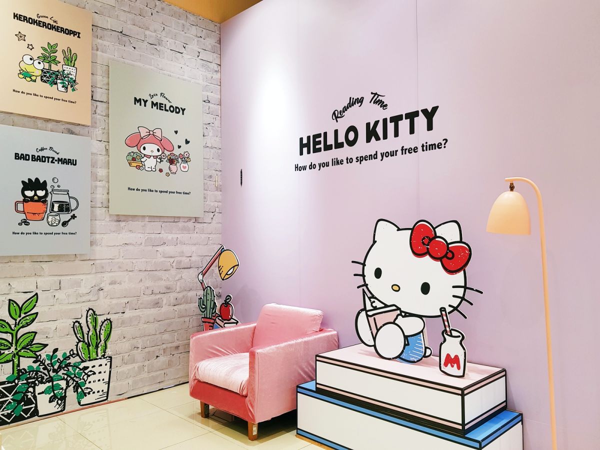 現場打造了4大超萌的拍照場景,剛進到百貨公司就能看到酷企鵝和朋友們趴在上面呢,還有大眼蛙帥氣溜著滑板、美樂蒂在美食櫥窗等著各位~而HELLO KITTY則在限定店內,備好巨型立體書、檯燈及粉紅沙發椅,等候粉絲來到店裡與她一起共度悠閒的閱讀時光喔!