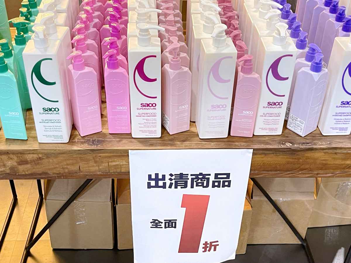來自英國的英倫潮髮指標純植萃護理 saco,此區也有很多洗護髮品,大小容量、不同髮質特性,都能滿足各種需求。1050ml大容量洗髮精及護髮乳,原價3,300元,也是以1折超佛價就能入手,也有250ml正常版包裝,原價1,320元,1折優惠只要132元,比開架洗髮精還便宜。