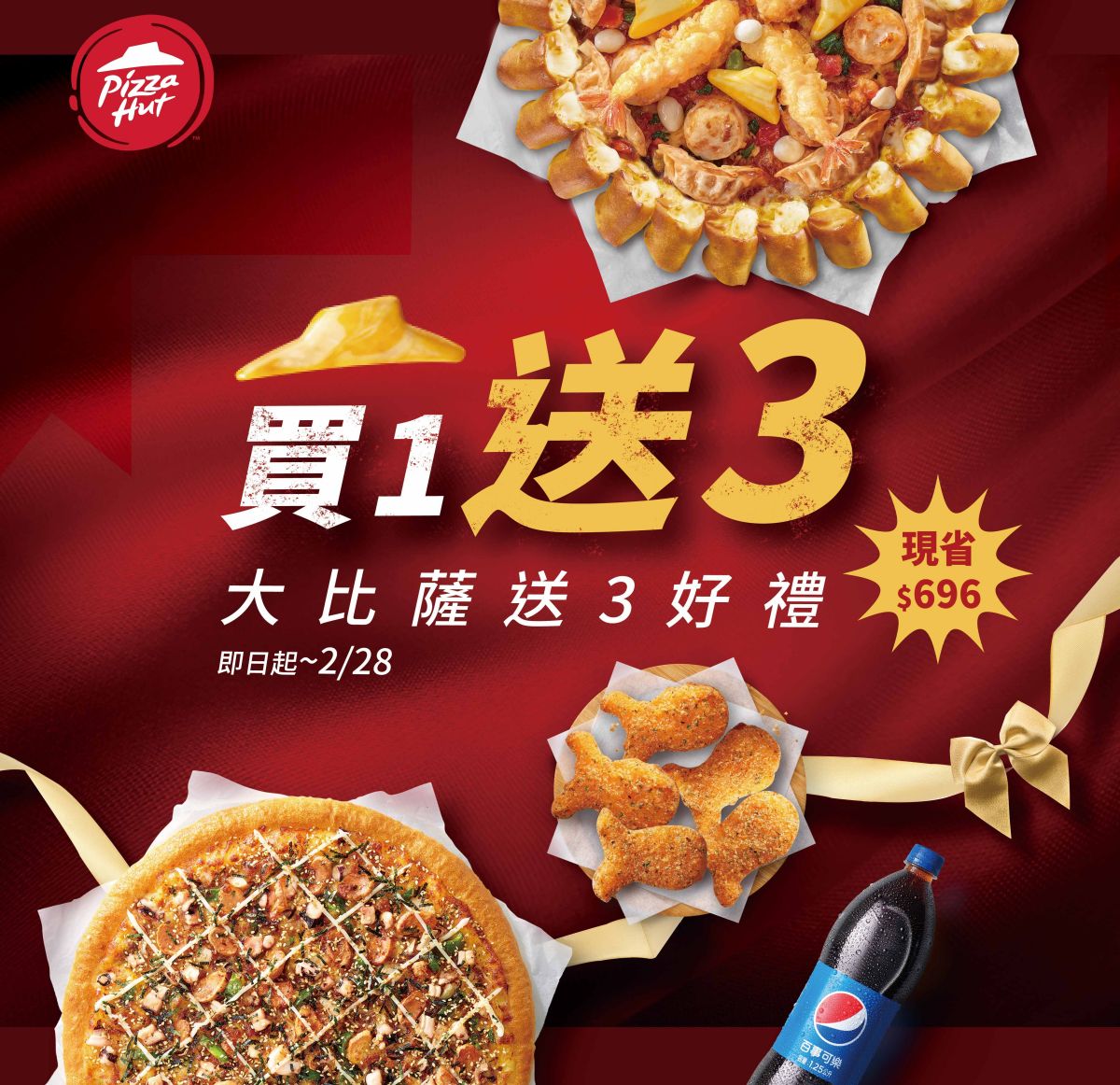 228連假到來必勝客「買一送三」超值優惠絕對是最划算又豐盛的首選!共15款以上大比薩皆可選擇,只要單點一份大比薩,外帶再贈送一份大比薩、1.25L可樂,還免費招待人氣副食「旋風肉桂捲」或「黃金和風鱈魚塊」2選1。(外送贈送小比薩)