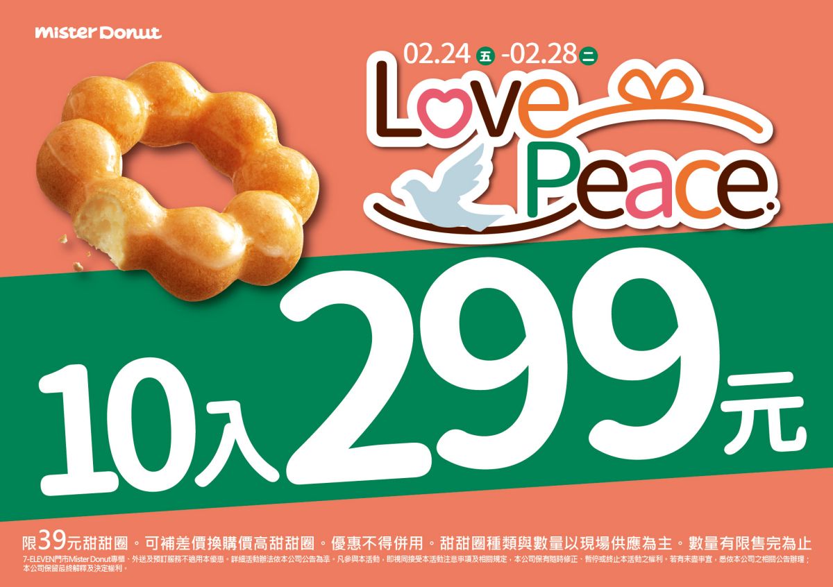 228連假即將到來,Mister Donut響應連休假期推出PEACE&LOVE甜蜜優惠,2月24日至2月28日期間,任選10入甜甜圈只要299元,平均ㄧ顆甜甜圈不用30元!