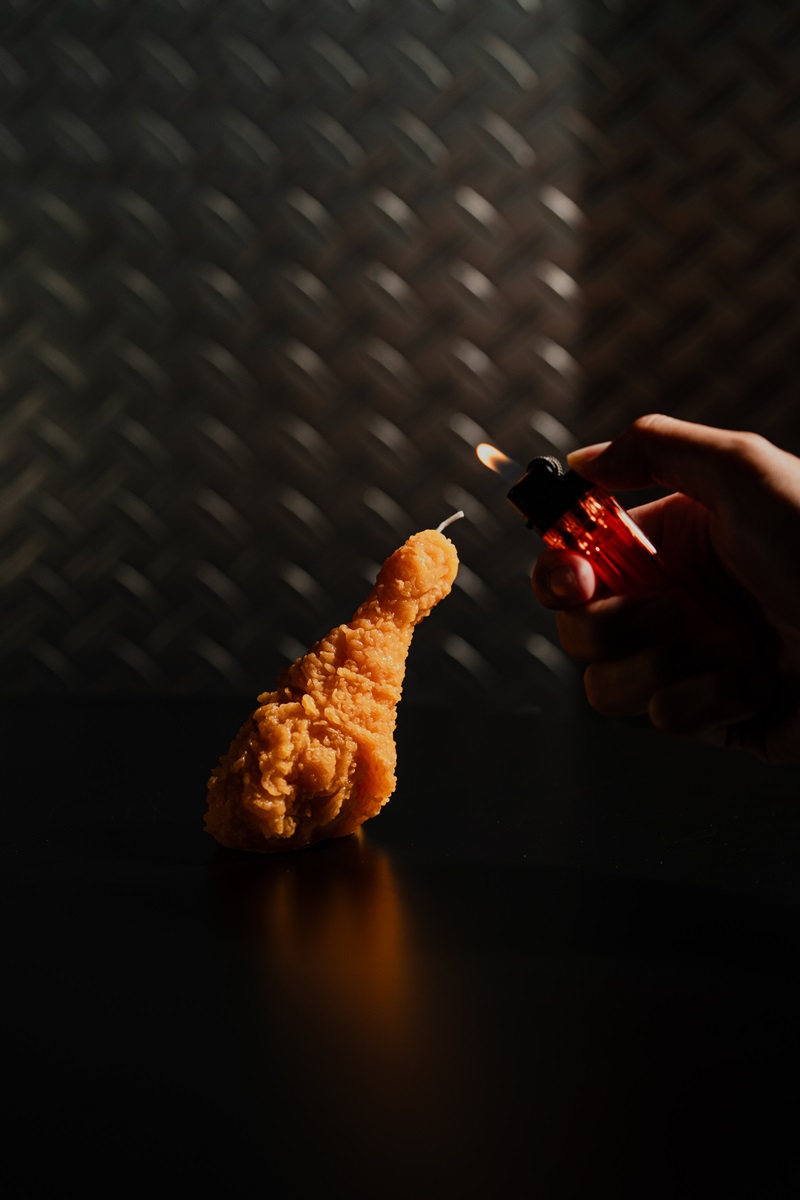除了炸雞,盲盒裡還有香氛品牌 EYECANDLE 打造的特製蒜味炸雞蠟燭,整隻炸雞腿造型超逼真,一點火就散發出蒜味炸雞味,超擬真超可愛,沒有單售,只有購買盲盒才可獲得。