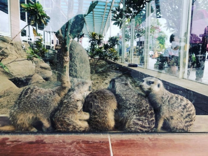 狐獴店員們會在庭院裡曬太陽、觀看來來往往的客人,妞妞們可以隔著窗戶觀賞狐獴療癒的模樣,雖說不能直接觸碰狐獴,但距離也蠻近的,能看見狐獴自由自在地小跑步(超可愛!),推薦給大家~