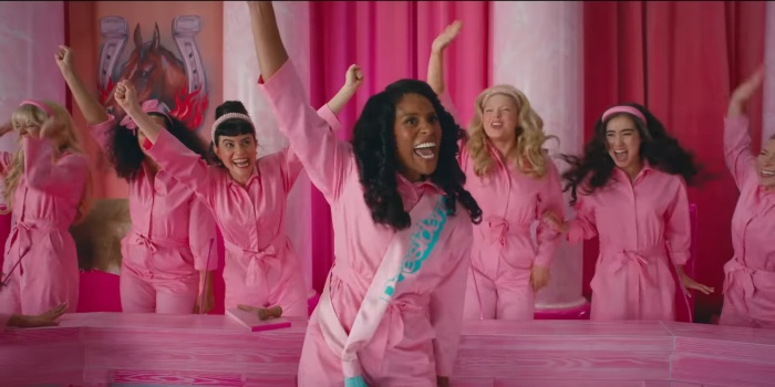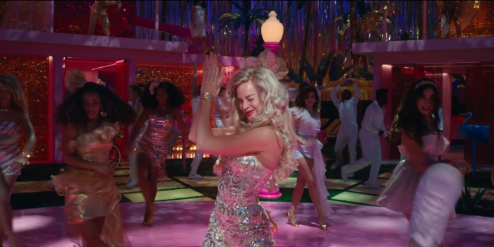 隨後換了個場景有兩套芭比經典造型登場,一套是瑪格羅比以閃亮派對造型裝束、一頭浪漫大捲長髮動感現身,另外是一套是青春洋溢的美式粉色格紋背心洋裝,搭配頭上的粉色蝴蝶結髮飾,期間還能看到不同膚色、身材與造型的「芭比」朋友們穿上芭比粉連身褲的畫面。