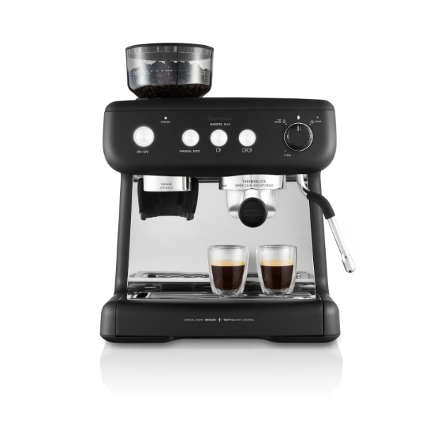 內置磨豆機,並搭載Tap&Go特有研磨技術,共有30種研磨設定,消費者可依據個人喜好研磨細緻的咖啡粉,即用即磨,隨時享用新鮮口感的咖啡,更配備 Temp° IQ Shot Control 智能萃取溫控系統,不僅減少熱機時間,更可精準控溫,沖煮出最完美的咖啡口感。全新 Barista 經典義式濃縮咖啡機 Max 碳鋼黑,其機身正面金屬部件及瀝水盤皆採鍍「鉻」處理,除增加表面硬度外,更具耐磨、耐腐蝕等特性,讓消費者便於清潔保養與整理。