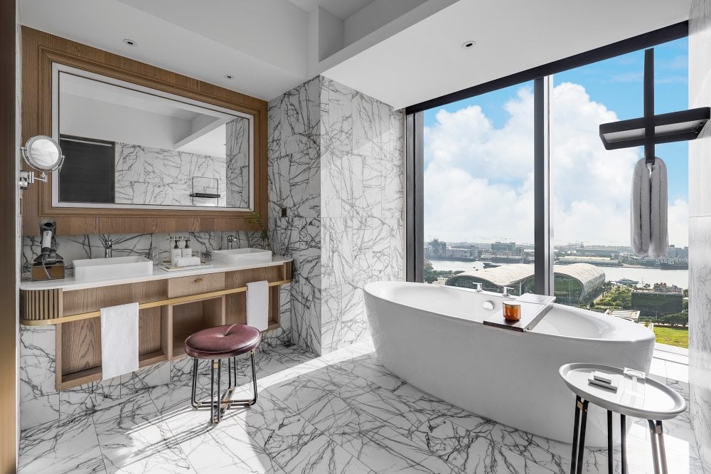 全台首間「洲際酒店」座落於高雄前鎮區,與遠雄集團全台最高豪宅垂直共構,建築空間以「高雄港灣城市印象」為設計靈感,提供「高級大床港灣海景客房」、「豪華雙床客房」、「大床單臥室套房」等房型,其中「行政客房」與「套房」採落地窗設計,不僅能盡情享受市景或海港美景,在部分房間中還能看到「夢時代摩天輪」!(高雄洲際酒店5大亮點)