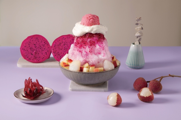 「合歡山」酸甜果物混搭台式洛神釀,山頂選用「舞間茶心」洛神冰淇淋,以百分之百原朵原花低溫研磨,保留其香氣和色澤,山腰的配料為荔枝、蘋果和「私房蔡先生」的漬蘋果,以埔里有機玫瑰搭配酸甜覆盆子,玫瑰火龍果淋醬則使用「大花農場」品種大花一號的玫瑰花瓣泥,完美結合各式酸甜口感的鮮果,香氣馥郁!