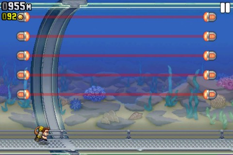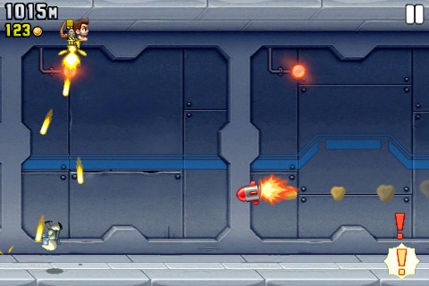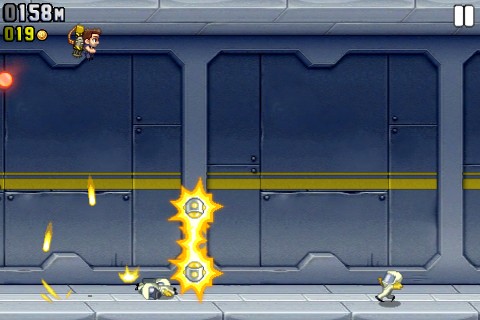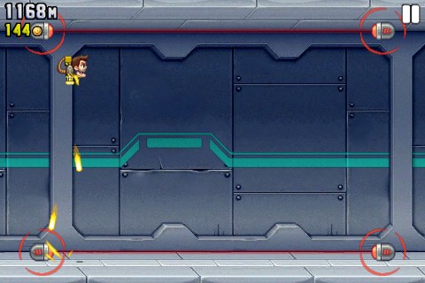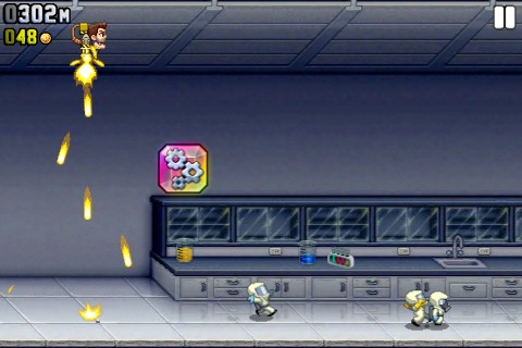 Jetpack Joyride的一大特色便是一根手指就能搞定的操作。按下畫面任一處都可以立刻發動火箭升空,閃避沿途各種打算置你於死地的邪惡機關,順便以機關槍掃射在地面上亂竄的死老百姓壞蛋們!