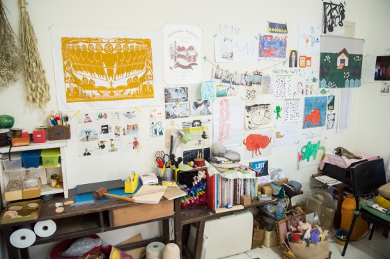 小虎的工作室一隅,充滿了創作所需的靈感筆記及素材。