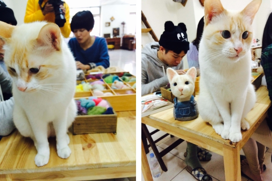 貓咪「勾雜」熱情不怕生,喜歡黏著人,在大家做羊毛氈時靜靜陪在一旁。