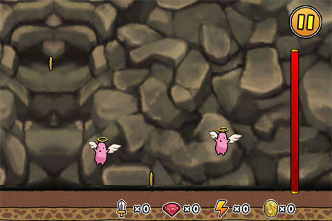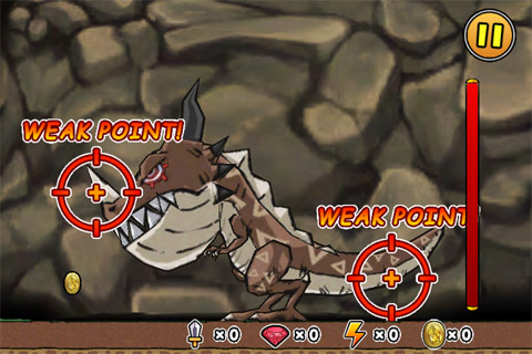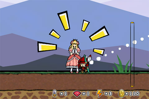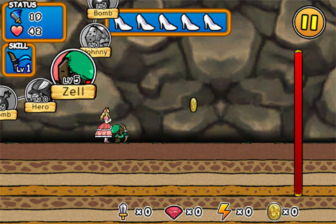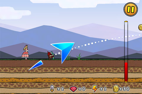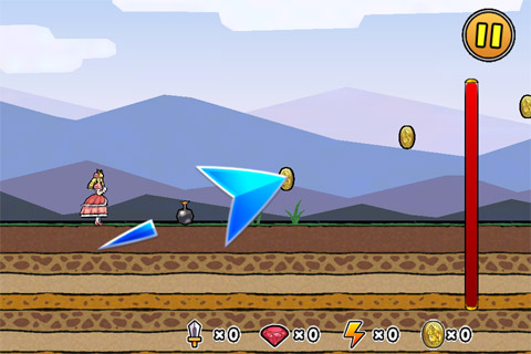 我方的狀況如上,公主站在王子身後躍躍欲試,畫面右方的紅色血條是怪物的總血量,空中的金幣是可以在飛越的過程中獲得的獎勵。