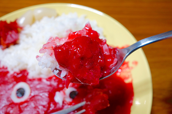 這款「史萊姆咖哩」總共有紅、綠、藍三種顏色。紅色是雜草口味(ざっそう味)、綠色是消毒水口味(どくけし味)(蛤???)、藍色則是藥草口味(やくそう味)。
