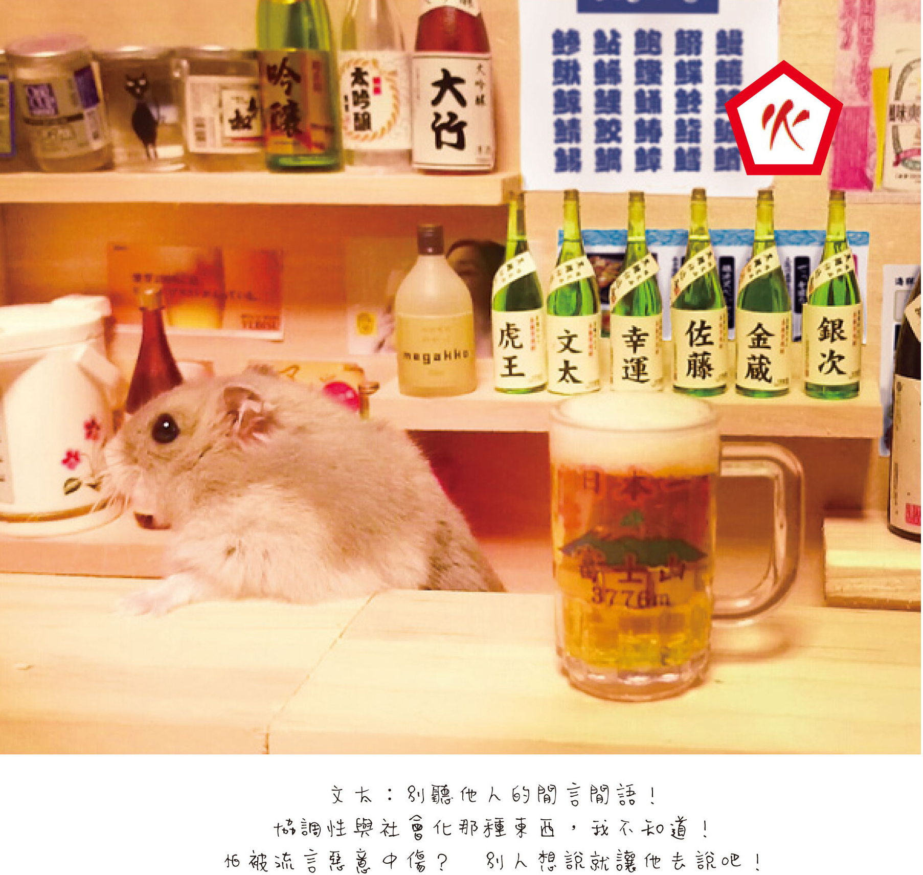 在網路上人氣非常高的「居酒屋倉鼠--銀次團隊」,有七隻個扮演不同角色的小倉鼠,其中最有人氣的就是首領銀次了,雖然牠在去年已經過世了,但其他的好夥伴們仍然繼承了牠的精神,並將一系列蘊含人生大大小小道理的名言佳句,持續推廣、分享出去…今天就停下腳步,來聽聽看這些史上最Q的倉鼠店員們怎麼說,來好好療傷、大醉一場吧!