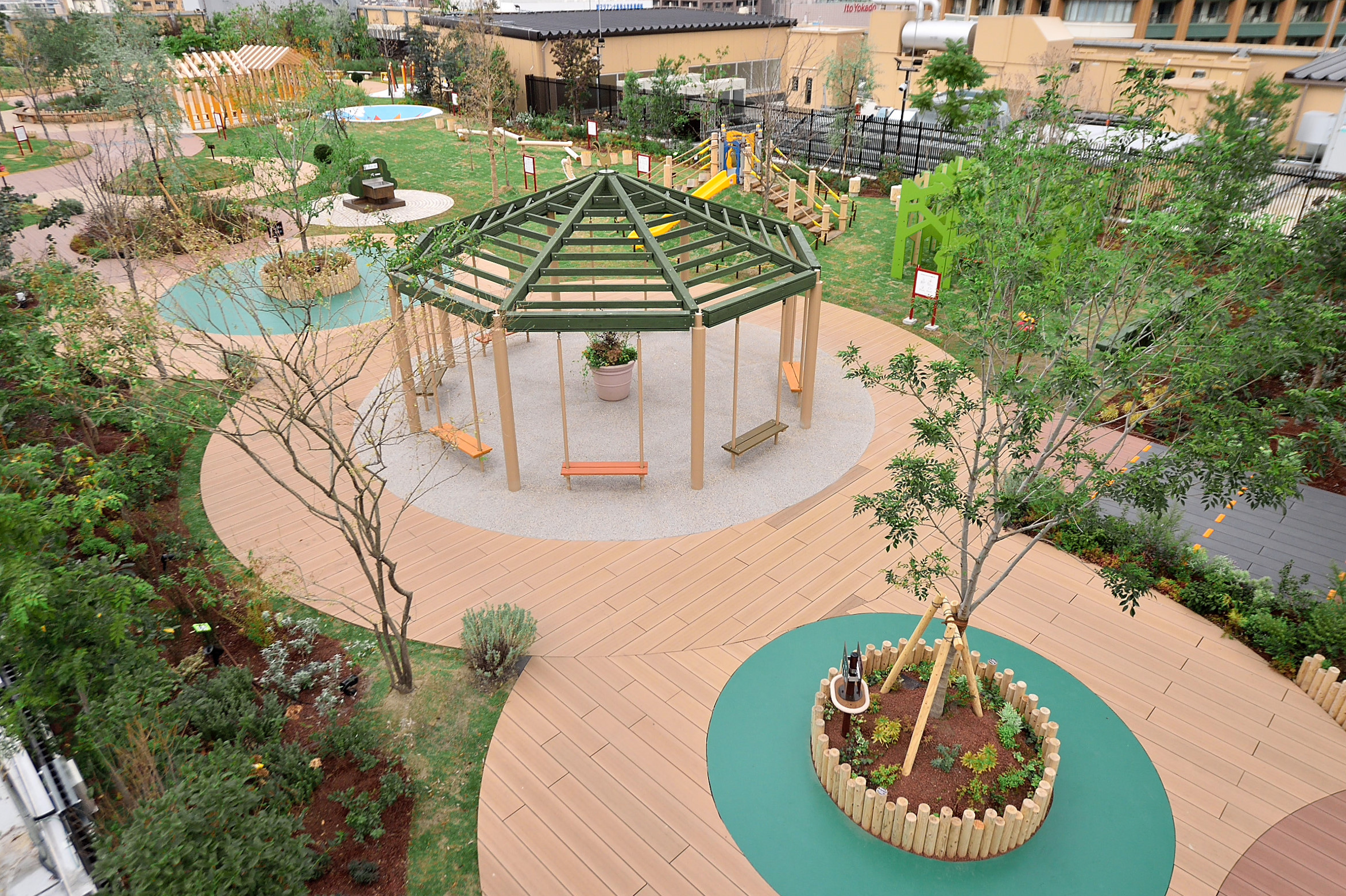 頂樓的庭園GRAND GREEN GARDEN,設計成優美的空中花園,彷彿來到自家附近的公園,內有遊樂設施供小孩無料玩耍,讓爸媽在逛街之餘,還能照顧心愛的寶貝。