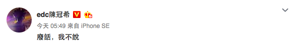 今日(20號)陳冠希也發了一張和《星際異攻隊2》看板的合照,配上攤手和無奈表情,配文:「廢話,我不說」,疑似是在回覆是否已經當爸了。不過,妞編輯真的覺得發了這5個字,把事情搞得更撲朔迷離,畢竟中文博大精深,逗點放的位置也會讓辭意改變……看來寶寶是否已經出世、或者秦舒培到底有沒有懷孕,只有當事人知道了!