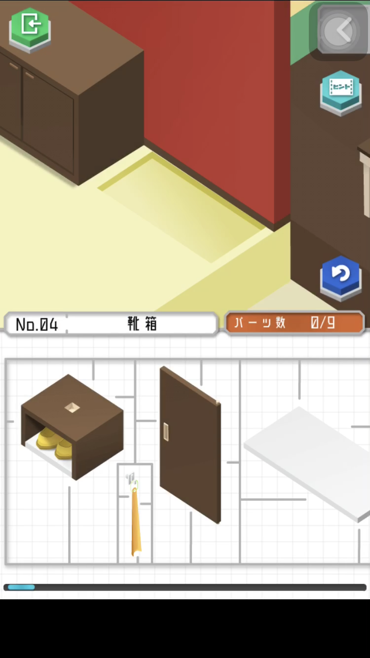 手機小姐已經解到鞋櫃了,所以就從鞋櫃開始介紹。用鑰匙開啟關卡之後,會進入模型屋的一角,畫面上方會顯示傢俱的位置,讓玩家利用下方的模型碎片,慢慢組裝成一個完整的模型。選好碎片之後,如果擺放正確,就能成功放上去,如果放不上去,就代表還沒輪到該碎片被放上去哦!
