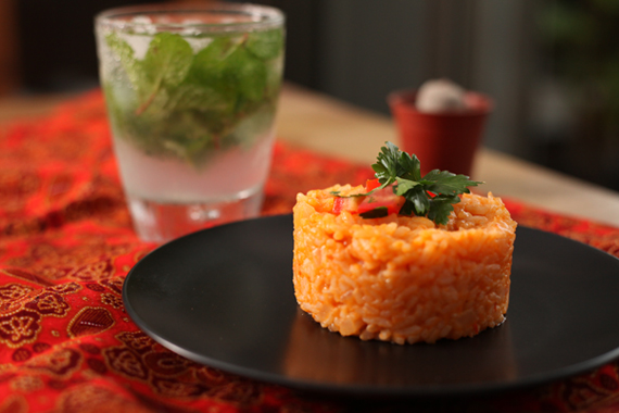 墨西哥番茄飯」獨具一格的橘紅,帶有蕃茄的甜美與些許煙燻風味,極度顯現墨西哥人的熱情豪爽,這道主食料理常常伴隨著其他配菜一起盛盤。而墨西哥人米食文化可追溯到十六世紀,米開始由西班牙貿易船隻從菲律賓傳至墨西哥,在那之後便在維拉克魯斯地區廣泛地被栽種,也漸漸成為當地菜單上的主食。