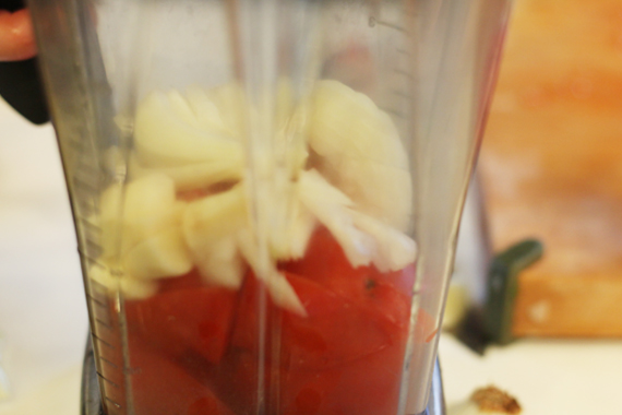 1. 將一半的洋蔥、蕃茄、大蒜與高湯放入調理機混合打成泥。