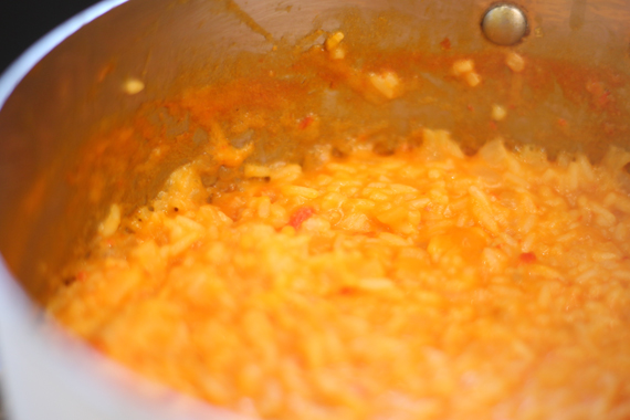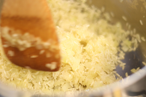 2. 鍋內放入少許橄欖油,放入另一半洋蔥炒至軟,放入米拌勻約2分鐘後加入步驟1的蕃茄高湯,以適量鹽調味。