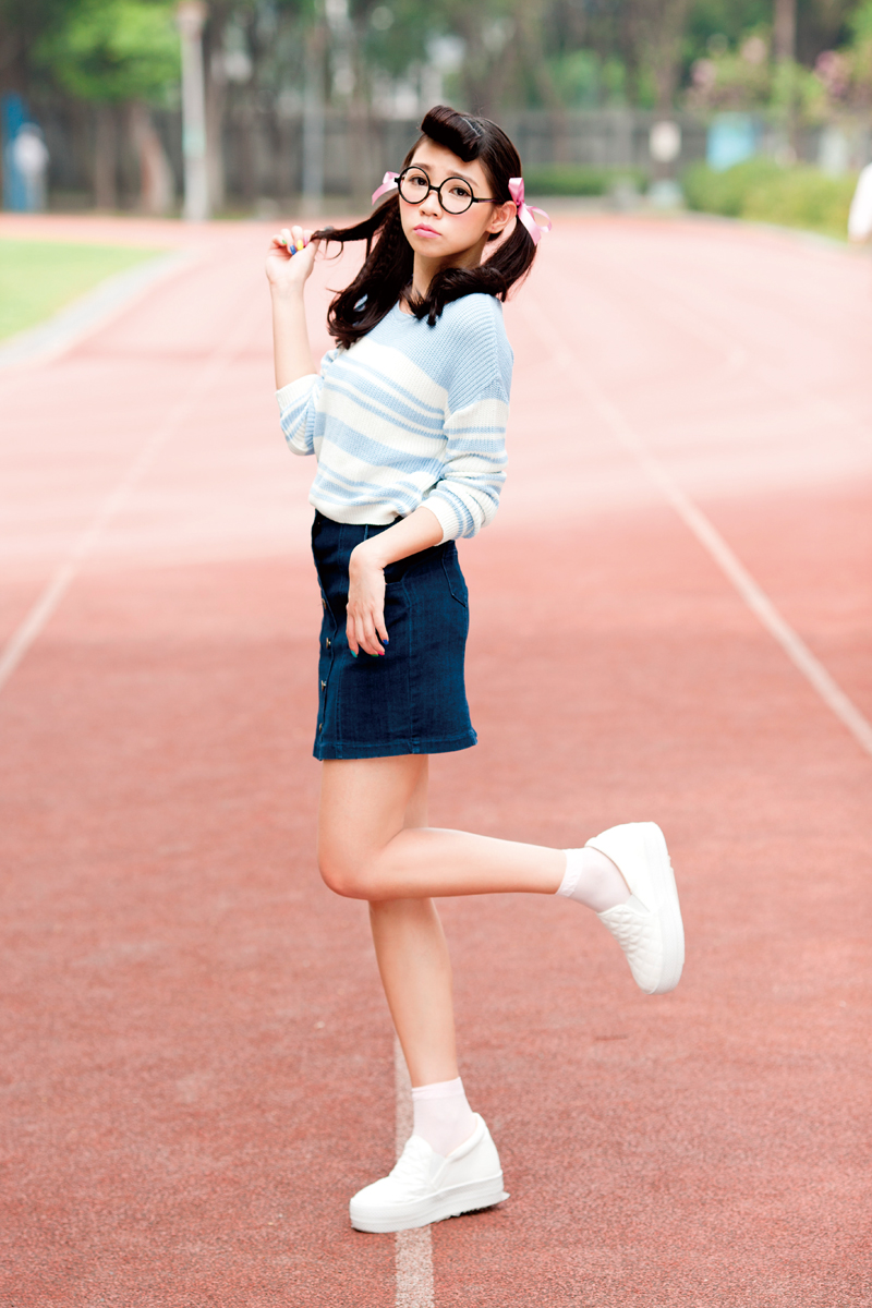 格紋和條紋不會搭?春夏格紋x條紋穿搭小撇步 愛女生、格紋、條紋、白色蕾絲窄裙、條紋襪、厚底鞋
