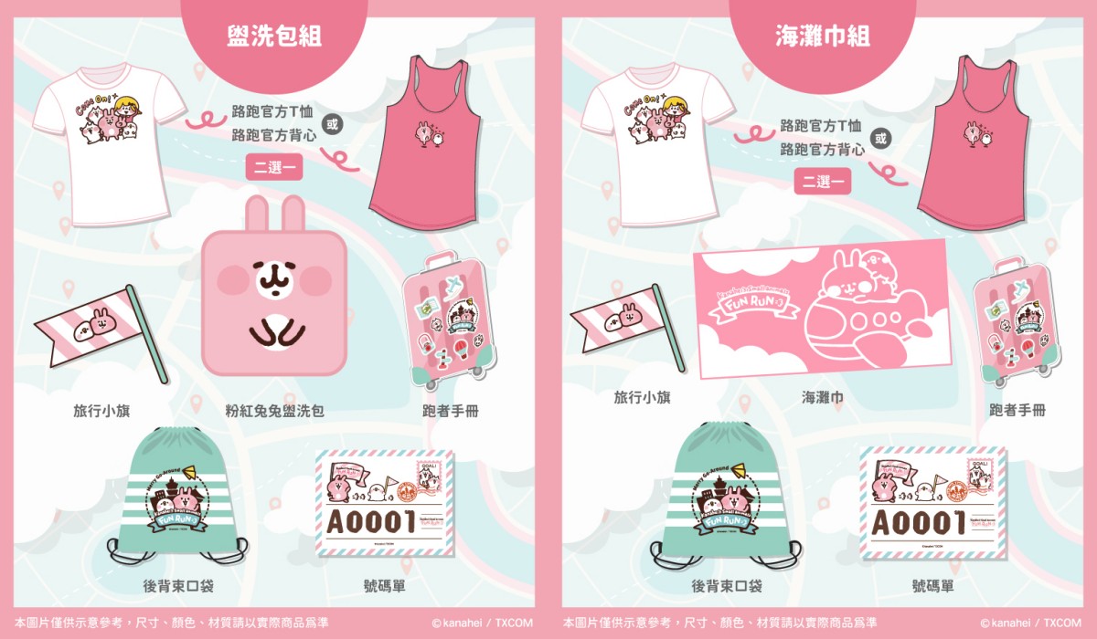 此次路跑的福袋都是日本授權的限量商品,每一款都超值得收的(為什麼只能挑一組呢?),有可愛的「豔陽萌帽組」、「粉紅兔兔玩偶組」、超實用的「趣旅行吧盥洗包組」以及夏天會用到的「可愛海灘巾組」。