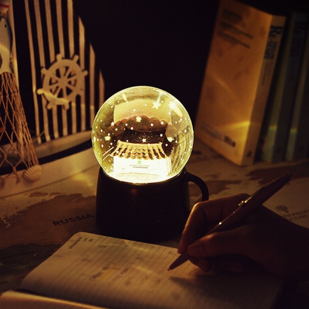 再來是本次系列最美的商品,夏夜星空LED水晶球,底座的造型是深藍色的杯子,還有流星裝飾,上面的水晶球裡是一棟古色古香的Starbucks,上下搖一搖還會有滿天的星星飄落,彷彿下了一場流星雨,美炸天!重點是,這款還可以點燈,晚上看更有氣氛~