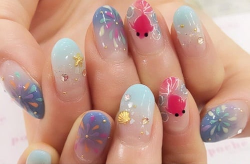 最後一款綜合了漸層、甲面留白、鉚釘貼紙元素讓指尖充滿濃濃的夏日風情。使用不同深淺的藍色,再以暖色系的金魚和煙火花紋點綴,讓冷色調多了一分溫暖。貝殼和海星指甲鉚釘貼則為指彩增添海洋感。