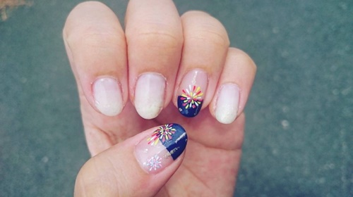 指甲塗上裸色或白色的指彩,並以留白的方式帶入花樣,就能襯托出煙火的絢爛繽紛。