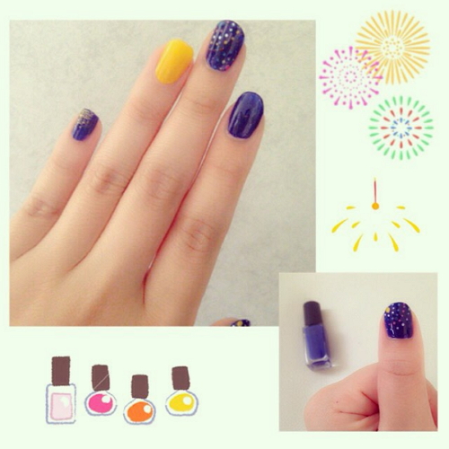 紫色與黃色的反差感配色讓雙手都俏皮了起來呢~煙火的裝飾更有畫龍點睛的效果。