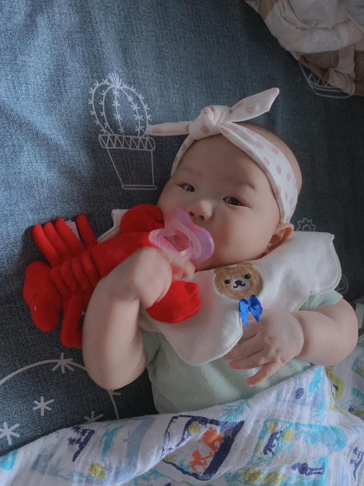 媽媽們還分享,同系列的玩偶都沒有龍蝦那麼好用,就是因為龍蝦的底部是平的,能夠平穩地安放在小孩胸口。媽媽們覺得呢?