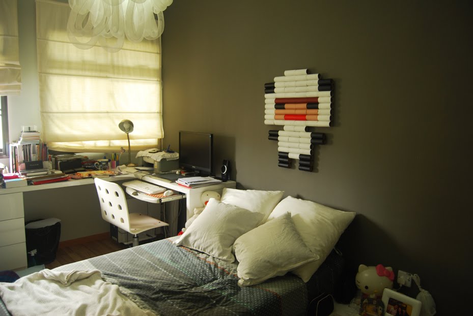 最後將塗好顏料的紙捲,一一按造位置黏貼在牆上,就完成專屬你自己的壁飾囉!