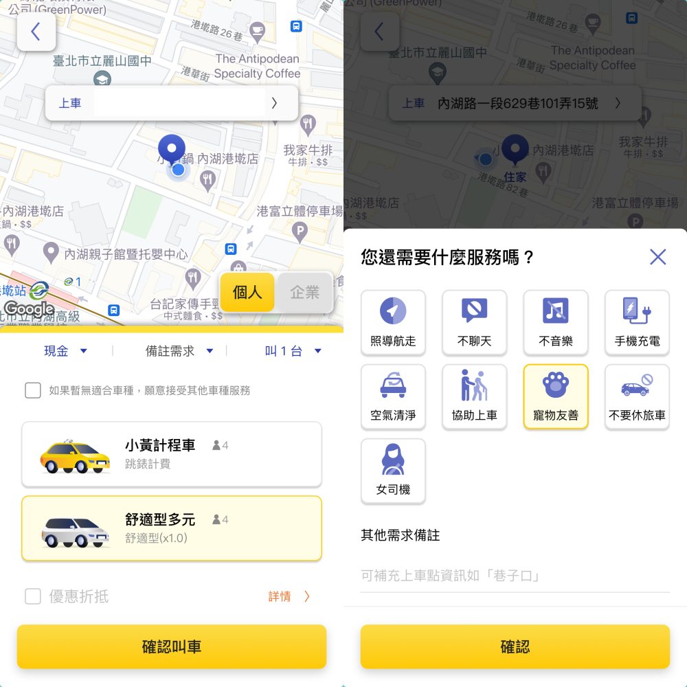 「台灣大車隊」應該是目前台灣最知名的叫車服務了,除了可以電話及App叫車以外,還提供多元計程車、無障礙專車、女性專車、機場接送、酒後代駕⋯⋯等服務,最重要的是它也提供「寵物專車」,同樣也可以在備註欄留下寵物資訊,疫情期間只要帶好口罩、做好消毒一樣可以帶毛小孩出門就診!
