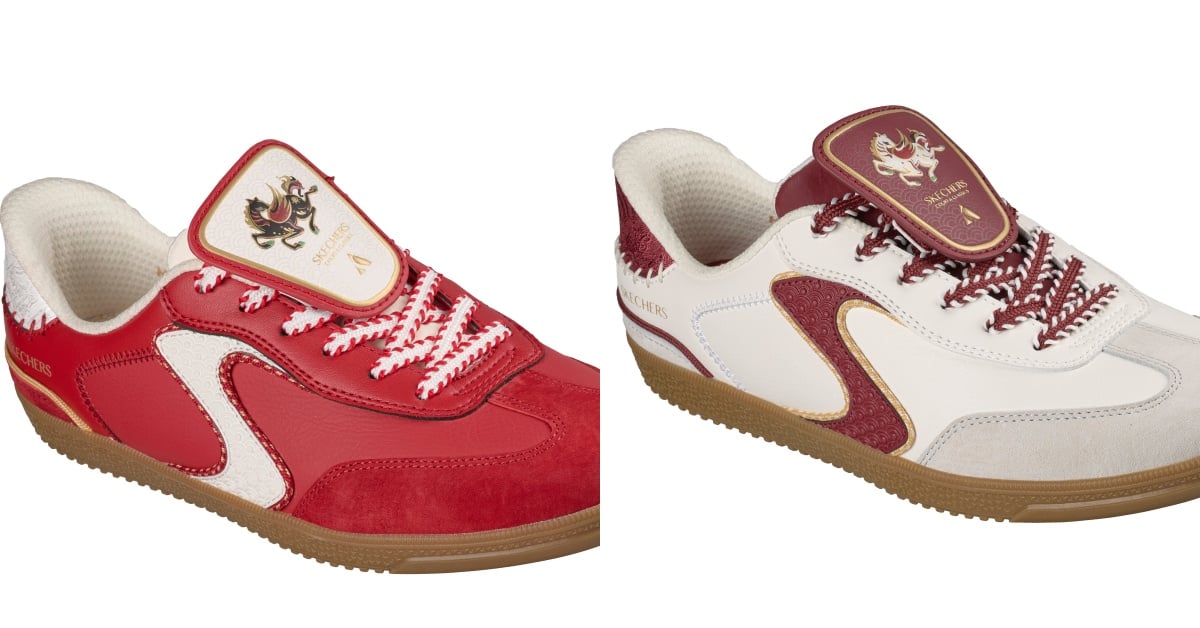 韓國人氣女團i-dle的台灣女孩「葉舒華」,親自示範的2色馬年限定鞋必須跟上!SKECHERS的經典德訓鞋 HOTSHOT 新年主題新款,特別在鞋舌空降「氣勢非凡的敦煌飛馬圖騰」超有開運氣勢,同時搭配盾牌造型皮革裁片裝飾鞋帶,側邊的招牌S型材質也充滿「年節東方風情」,不論是紅或白色都應景又百搭。